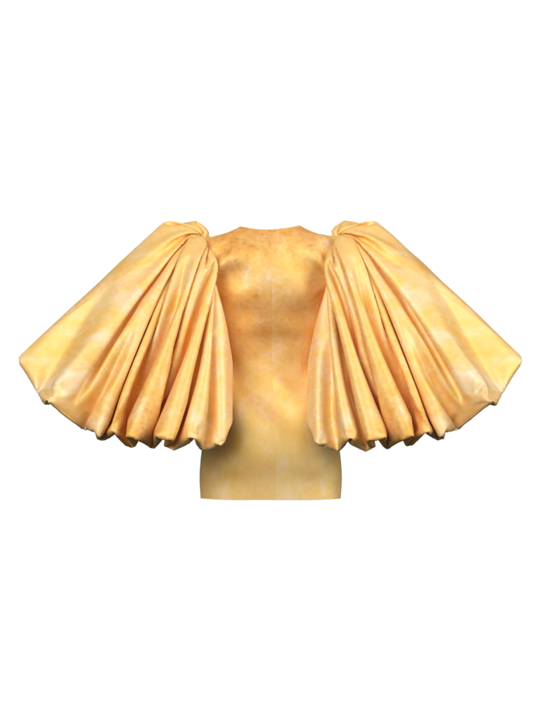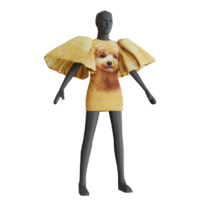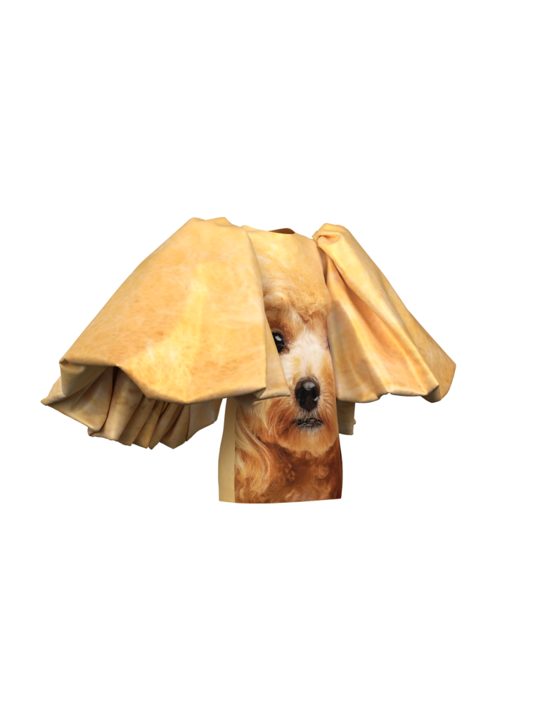 Holly’s adorable portrait is imprinted from the body to the hem of the dress. The puffed-up sleeves cleverly mimic Holly’s ears, bringing a whimsical and fluffy charm to the dress when worn.