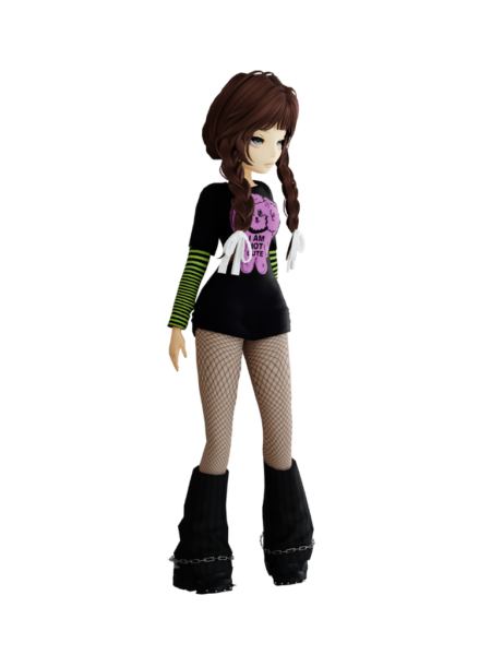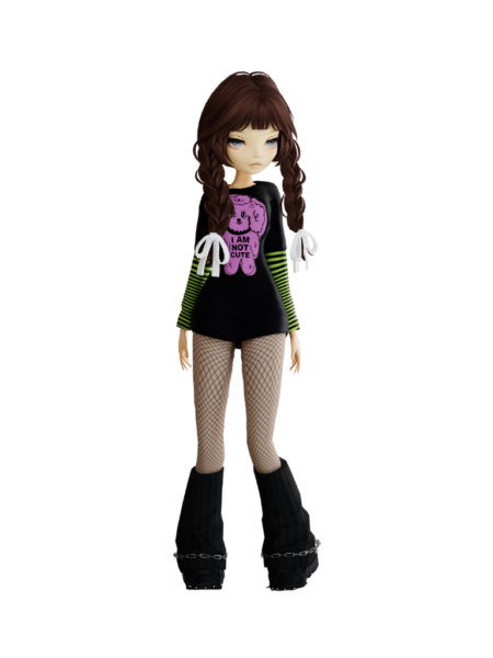 The collection includes standout pieces from Celine’s “”NEVER CUTE, ALWAYS ADORABLE”” line, a daring and unapologetic reimagination that challenges the brand’s traditionally “kawaii” aesthetic. Featuring graphic prints, metal-studded accessories, and Celine’s signature dog motifs, the designs capture the spirit of cute rebellion. Punk-infused elements are artfully contrasted with soft, puffy silhouettes, embodying the raw, youthful energy of a generation that redefined mainstream ideals of beauty and perfection. The fluffy puffy top-skirt set channels Holly’s bold transformation, blending playful charm with daring rebellion.