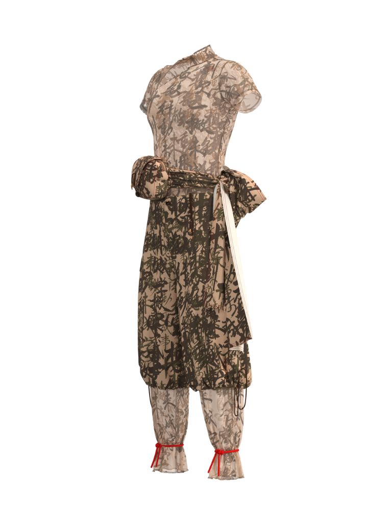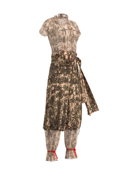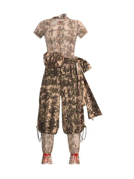 Bamboo Camouflage-printed Headpiece in Cotton / Bamboo Camouflage Mesh T-shirt with Frog Button / Bamboo Camouflage Cotton Hand-tied Knot Waist Bag / Bamboo Camouflage Print Cargo Pant with Draw String