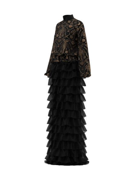 Imperial Couture Ruffled Long Gown with Floral Lace – FabriX
