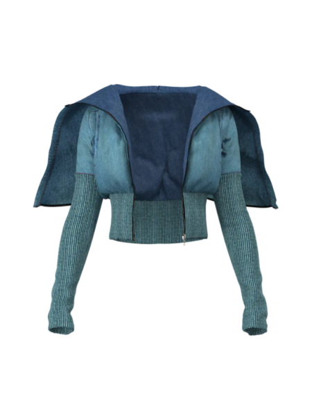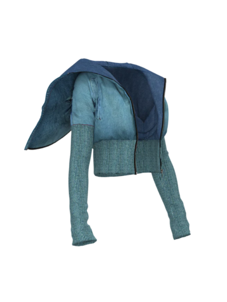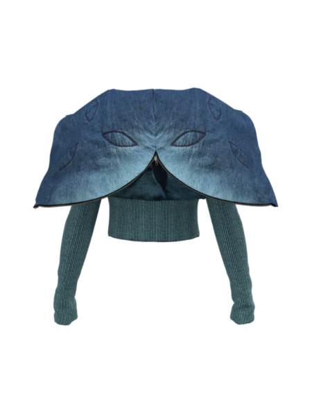 這件翠藍色洗水的短身連墊飛行員夾克是 Masha Popova AW23 GRIT 系列的作品之一,以單一質料織造,展示設計師標誌性的牛仔布處理技術,配有花花圖案、拉鏈帽子和以複合羅紋織造的袖口和下擺;此作品由虛擬到實體均貫徹其可持續精神,無論外層、內裡及填充物均為可重用的 100% 純棉製造。