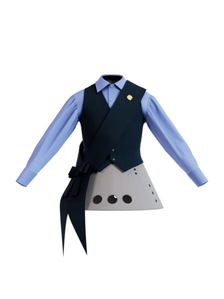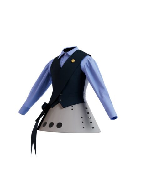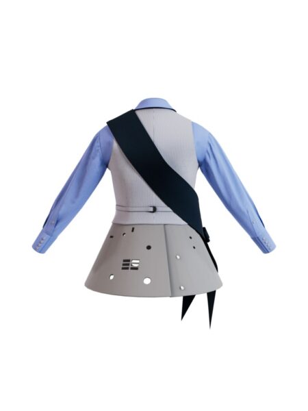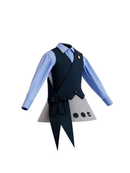 一件淺藍色襯衫配以經典領口與袖口設計,襯以採用不對稱剪裁並配有側邊領巾設計的深灰色雙排扣馬甲;下身配以加入戲劇式芭蕾舞裙結構的淺灰色貼身長褲。左側領口上的金色胸針和手杖,塑造出獨具戲劇性與未來感的設計概念。