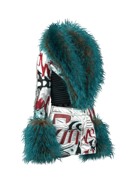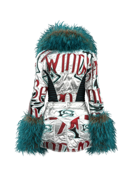 這套裝將懷舊和科幻元素相互交織,散發出獨特的復古未來主義,並帶出更深層次的人文主題。這款矚目的拼接套裝搭配相應的襪套,擁有毛毛刺繡及相似圖案。