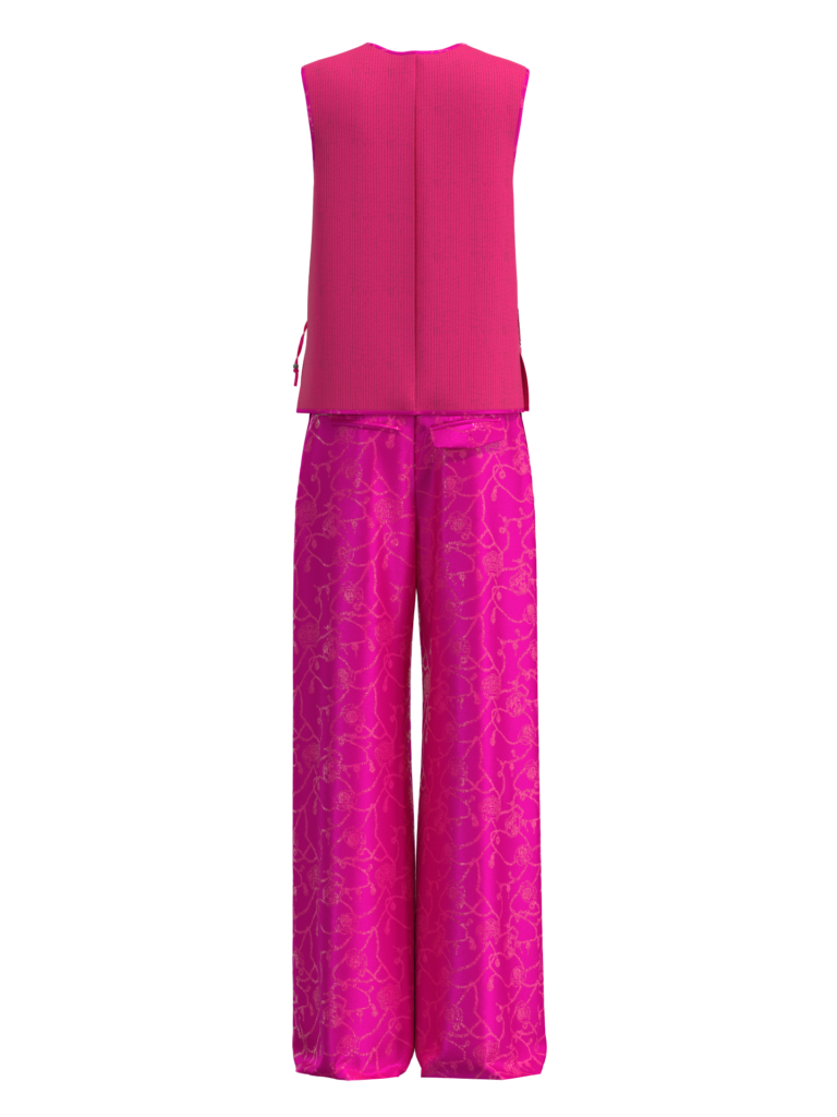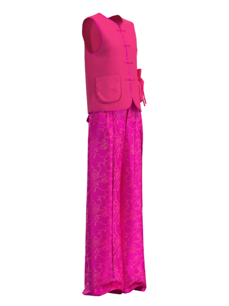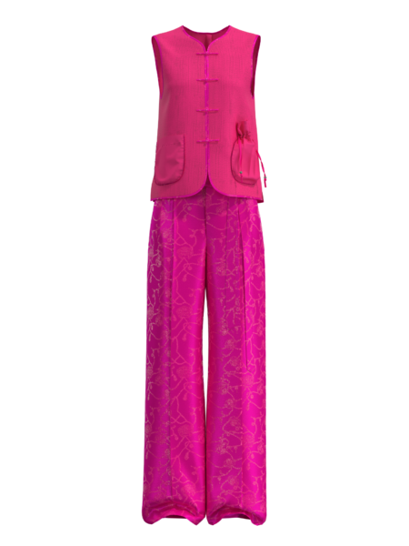 2024 春夏年米蘭時裝週春夏男裝系列中亮相的桃紅色背心,新中國時尚的別緻細節凸顯在口袋以金錢包形狀設計中,配上抽繩細節,有著祝福財源滾滾來之意。