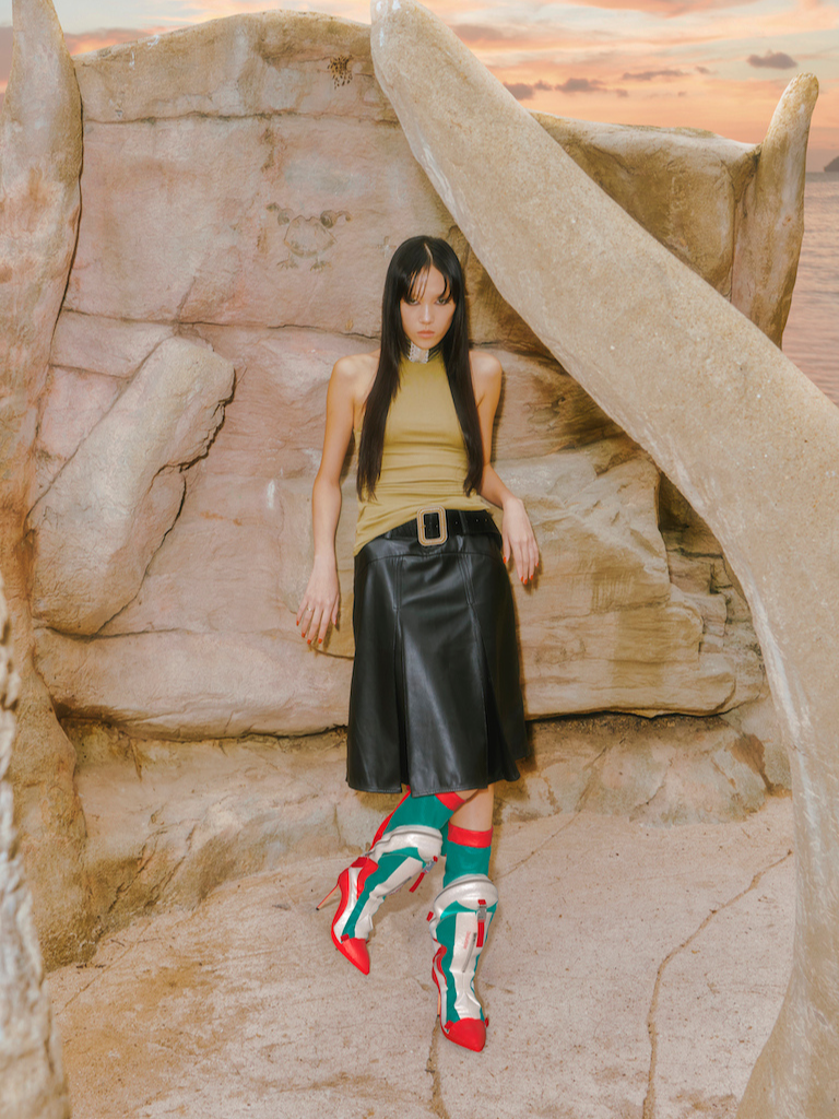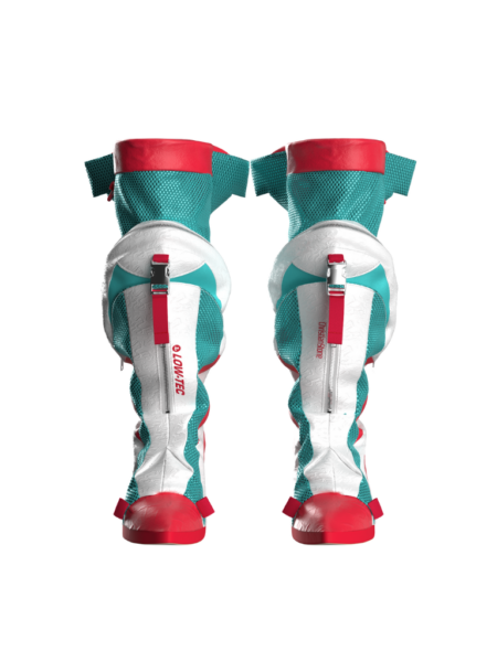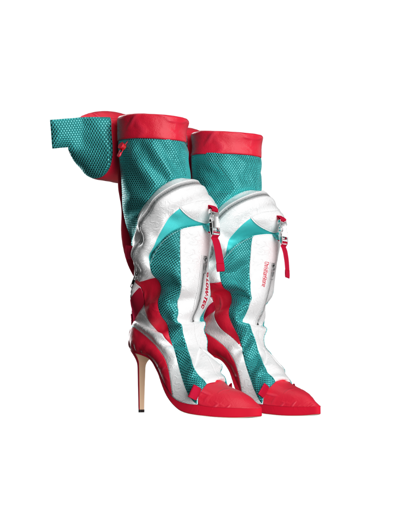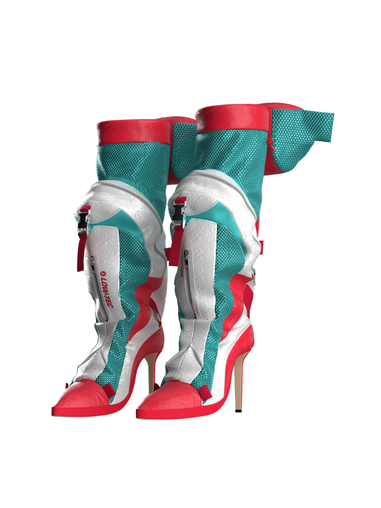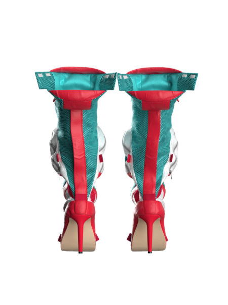 結合背包的實用性及高跟鞋的精緻度,生出一個獨特又驚喜的設計!前方的大型儲物格可取代一般包包,適合出席派對穿著;長靴後方採用風褸式繫扣,並上延至靴沿的迷你兜帽。整體配色亦以經典高達機器人為靈感。