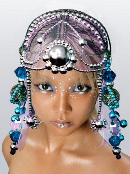 A pearl and iridescent bubbles headpiece. Inspired by Chinese mythology and the Five Elements, experience a magical transformation into a mermaid goddess simply by wearing this beautiful enchanted headpiece made of pearls and water bubbles.