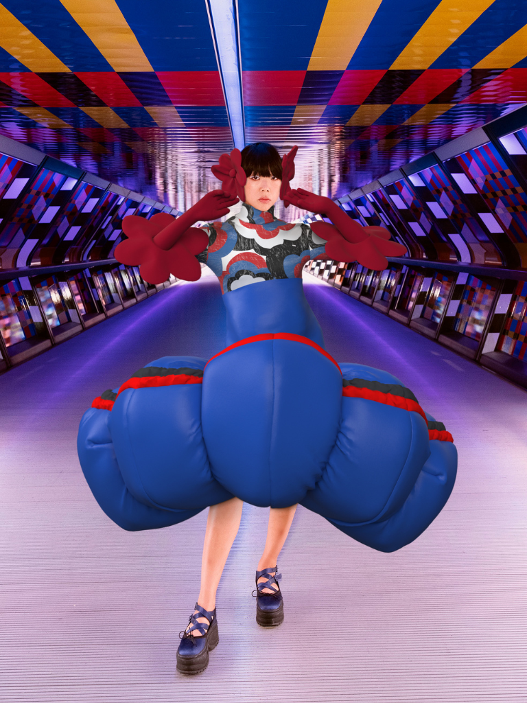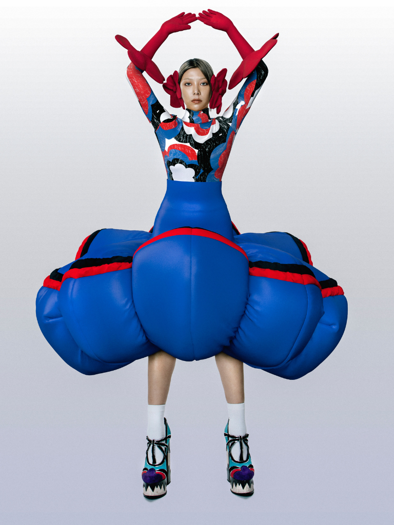 Celine Kwan’s inflatable flower skirt perfectly encapsulates her desire to bring a smile to the faces of people who experience her work. Dramatic, inflatable silhouettes are brought to life by bold, colourful prints – a signature of her brand’s larger-than-life personality.