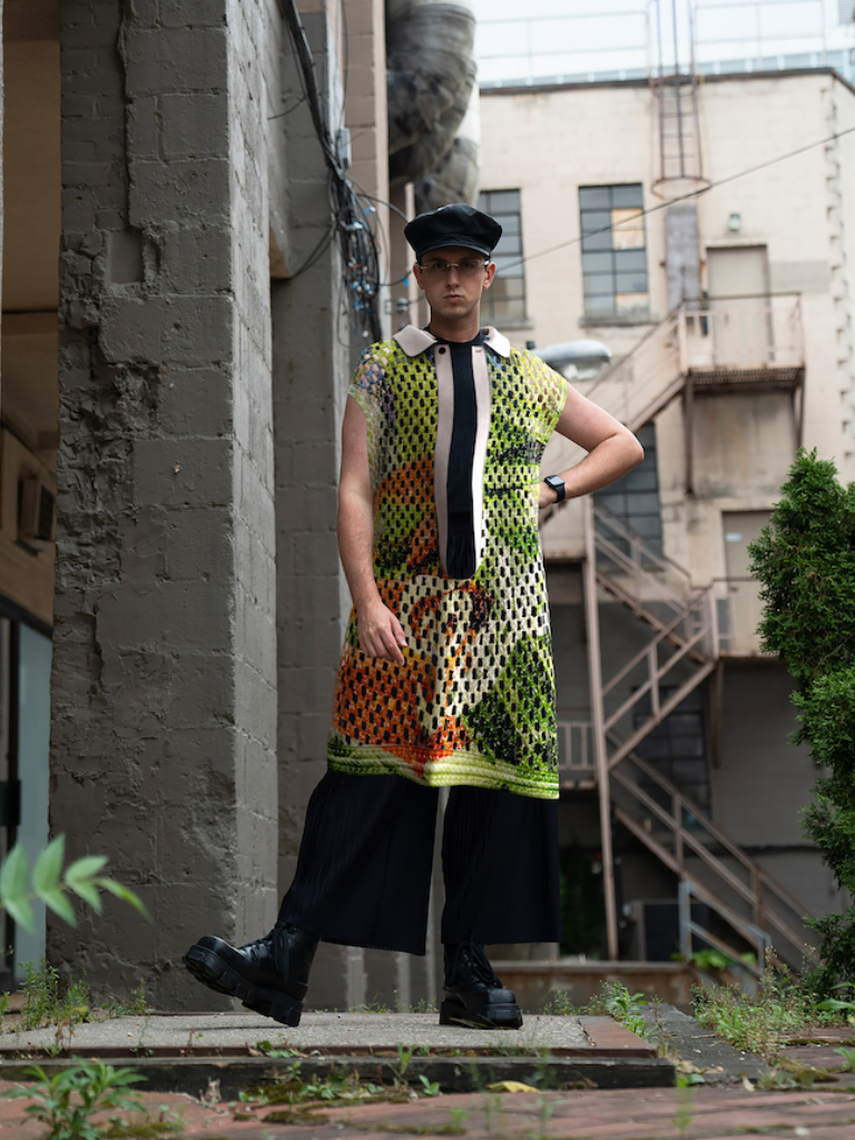此設計絕對是秉持 PONDER.ER 對可持續性承諾的標誌之作。背心採用品牌多年來持續精進的手工鉤織製作。背心的紗線由工廠收集的廢棄尼龍布料製成,為廢物賦予新生;上面的數碼印花圖案,為再造物料注入現代風格,令作品兼具手工藝及前衛感。