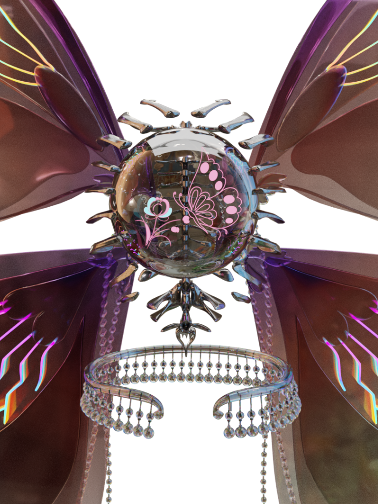 作品來自 Jüü Jüü 的「Alien Goddess Transformation」系列,靈感擷取自中國古神話中的一眾女神及金、木、水、火、土之五行元素。神話中,眾女神均佩戴各種頭飾及飾物以獲取神奇力量。只要戴上本系列,買家將會根據五行元素化身成不同神話角色,讓身心靈在元宇宙中獲得正面的療癒力量。