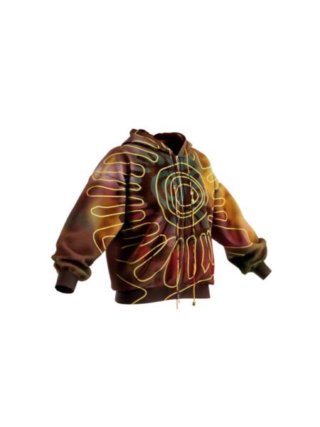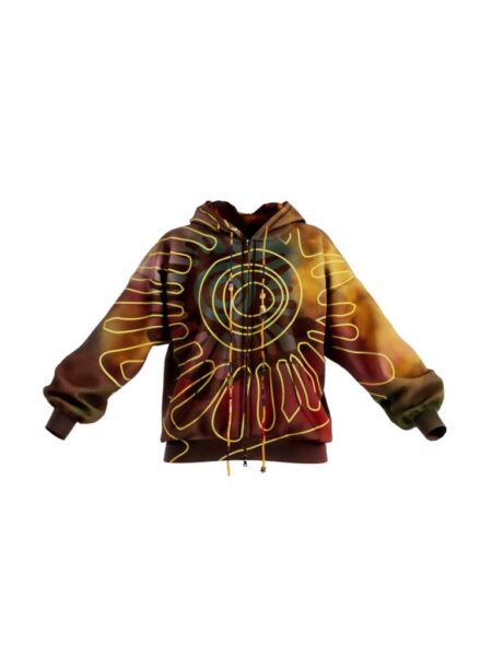 This oversized hoodie cuts a contemporary, laid-back silhouette with a traditional flair. The rainbow spray colours evoke the hues of a sunset, while the bold, tribal-inspired sun screen print on the front adds a sense of airiness and warmth. The hood pullers are handmade friendship bracelets, adding a personal and artisanal touch to every piece.