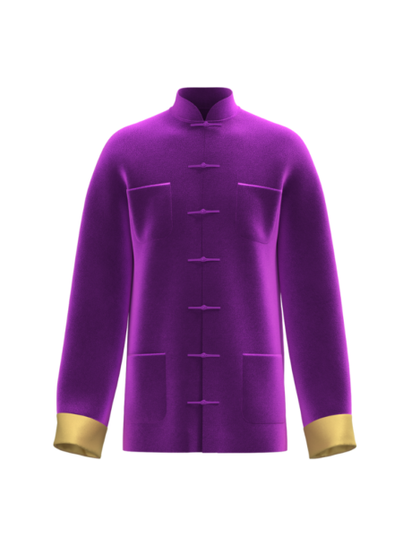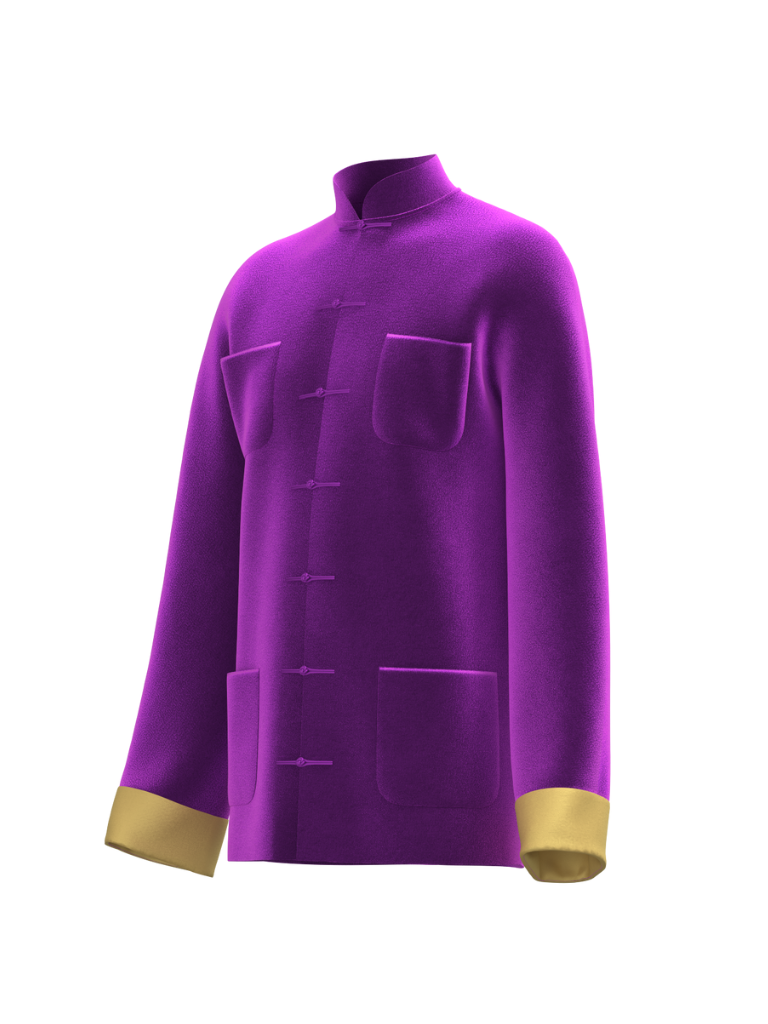 天鵝絨帝王紫色的唐裝神秘又高貴。在中國傳統中,高貴的紫色與帝王、聖人及永生有著意義上的聯繫。