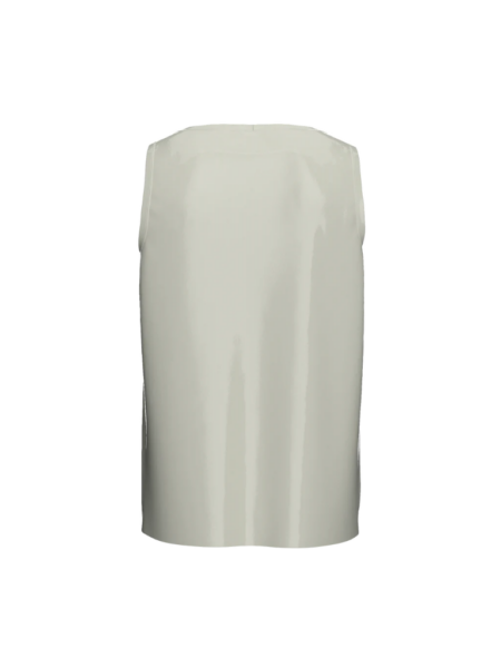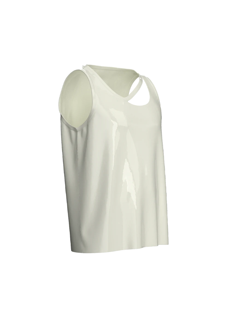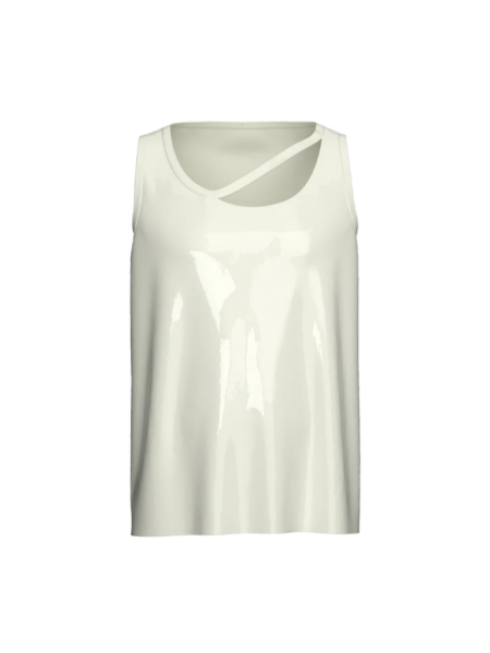 以非對稱主軸勾劃領口線條的白棉無袖上衣,配合以 60 年代光面汽車車身為靈感的獨有質感效果。