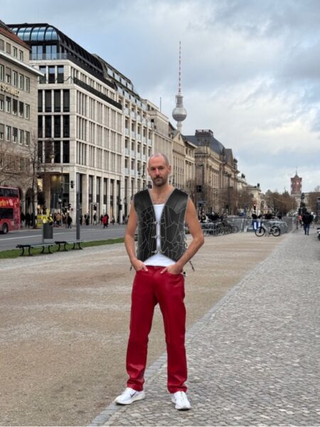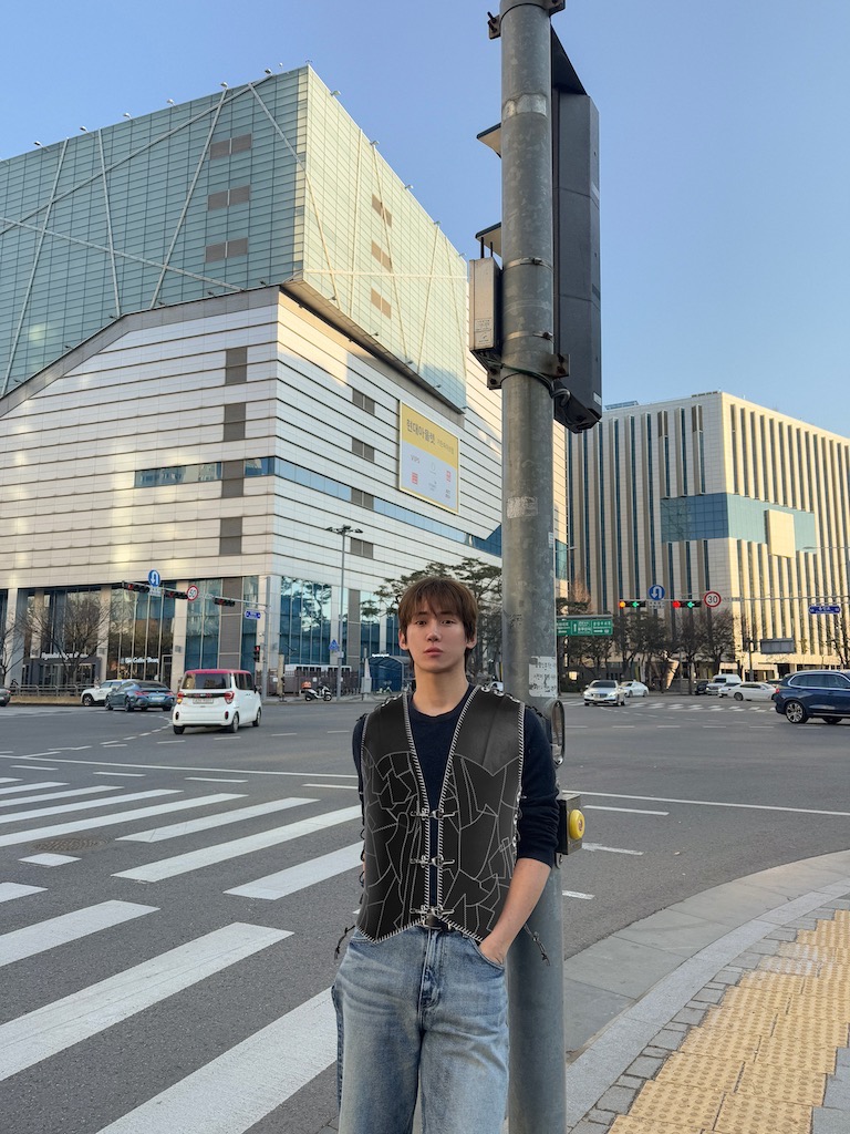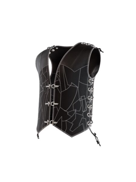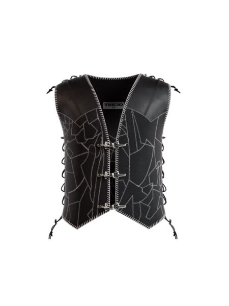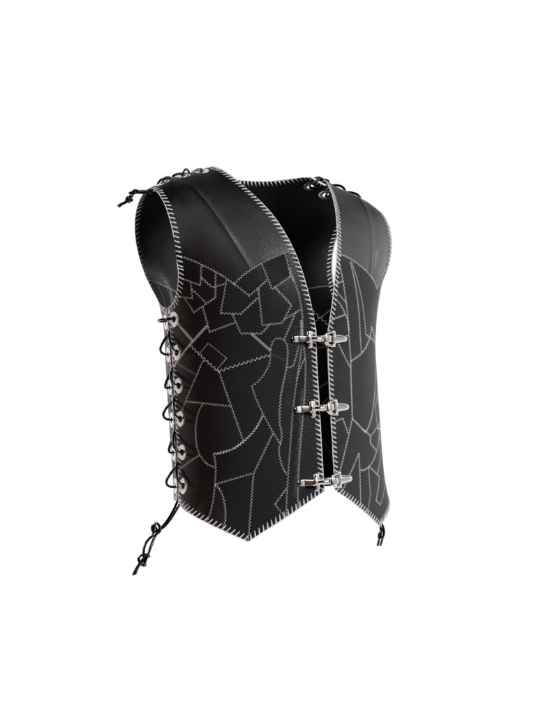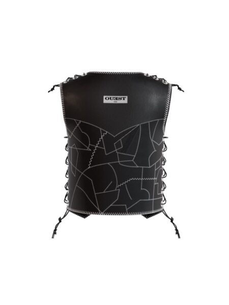 由 OUEST Paris 帶來的這款再生潛水面料騎手背心外套,絕對是可持續時尚的代表作之一。利用回收的滑浪連身衣,每件背心均由手工縫製而成。以純白縫線在全黑底色上形成不規則的幾何圖案為主軸,配合金屬啪鈕、排扣、鉚釘及綁帶圍邊細節,大幅增加了背心的粗獷美感。創新地使用潛水面料作用料,賦予了背心外套獨一無二的風格。同時通過重用廢棄物料,彰顯出品牌實踐環保承諾的決心。